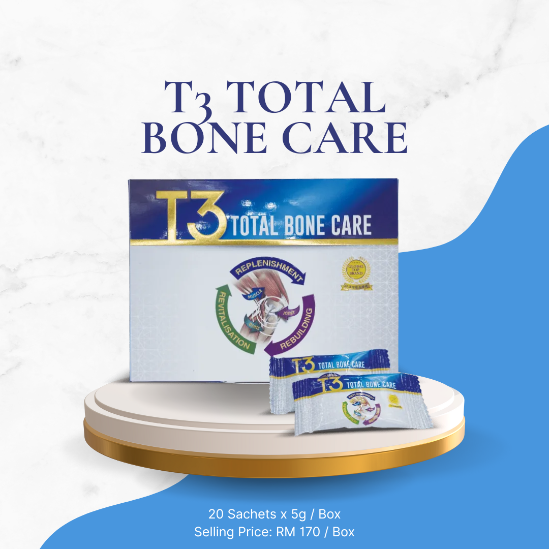 T3 total bone care, are developed through Micro Cell Molecular Biotechnology (MCMB), a patented German bioscience technology. It is a food supplement specially formulated for bone and joint health. It consists of water-soluble collagen and multivitamins, which provide our body with the components it needs to produce collagen, supplying bones with the nutrients and component to improve bone and joint health. It is a specially formulated health supplement for bones and joints.